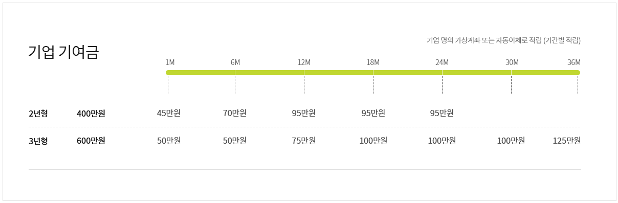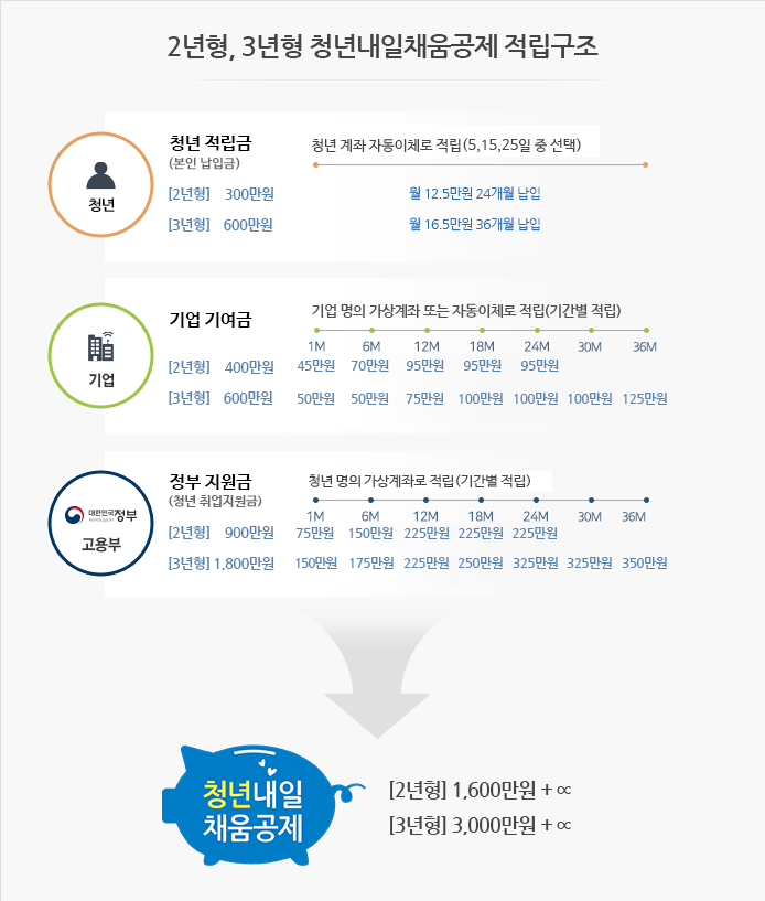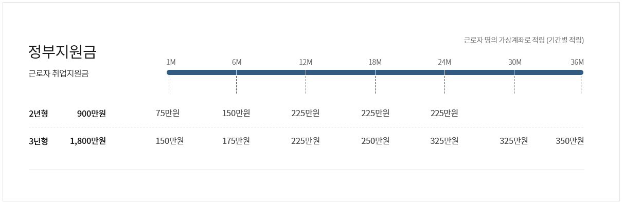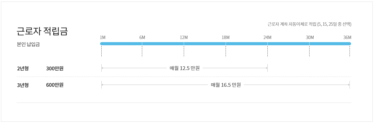 2년형 : 근로자 납입금 300만원(매월12.5만원) + 기업 기여금 400만원 + 정부 지원금 900만원 = 총 1,600만원