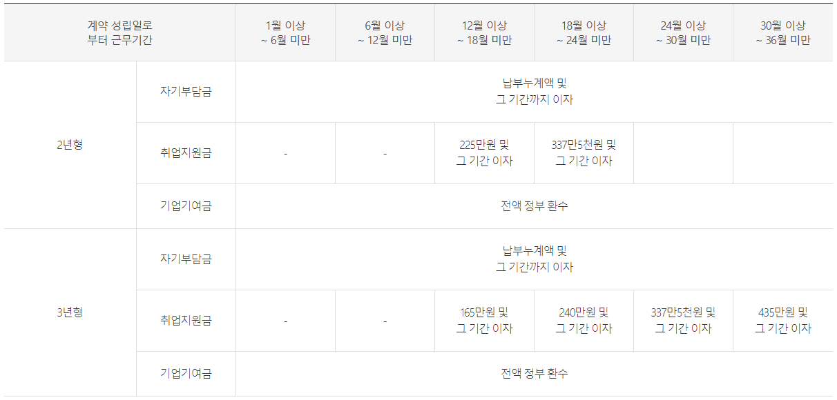 - 기업기여금은 정부에 전액 반환(사망 등의 사유로 중도해지 경우, 6개월 미만 - 정부반환, 이외에는 본인에게 지급).