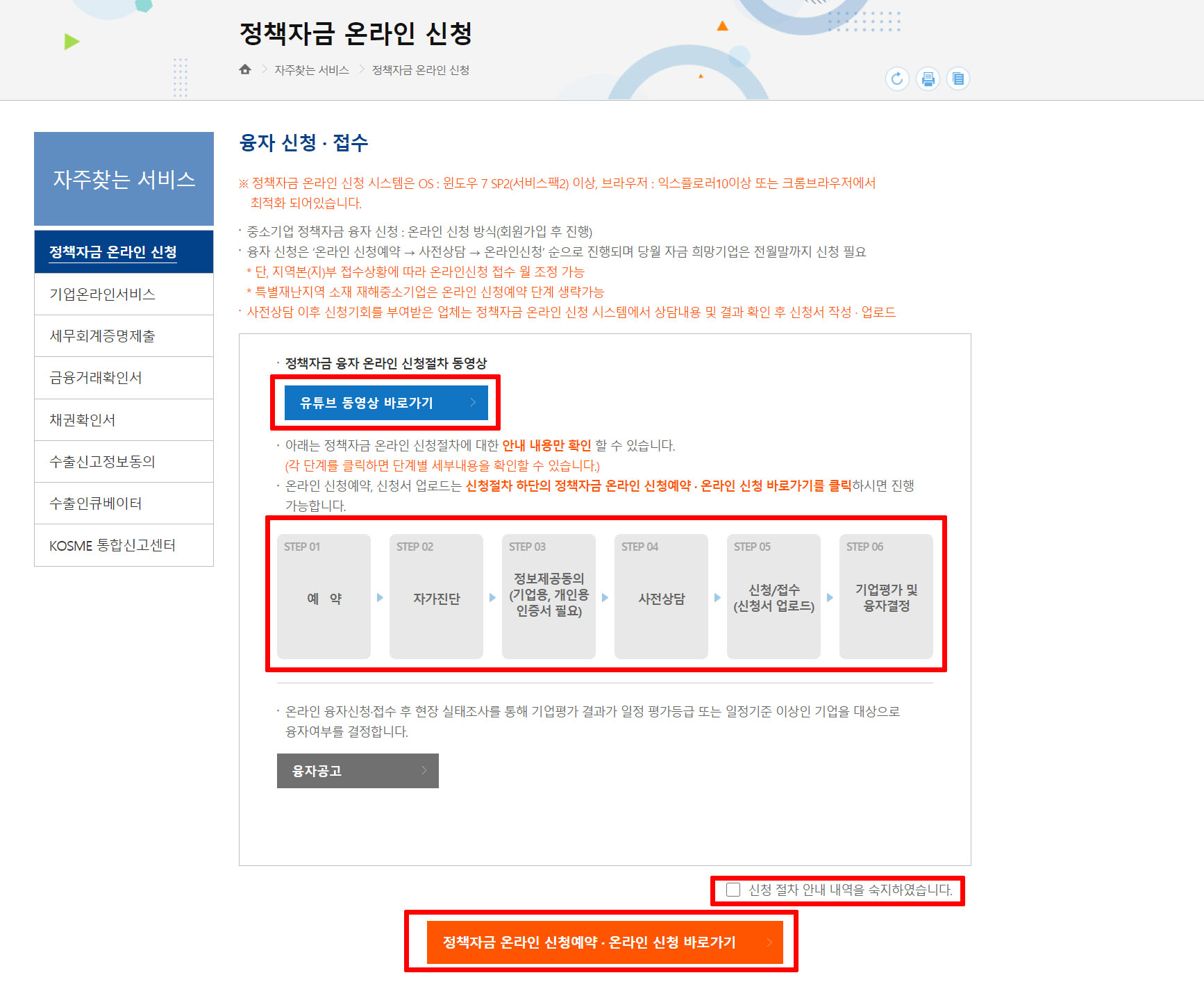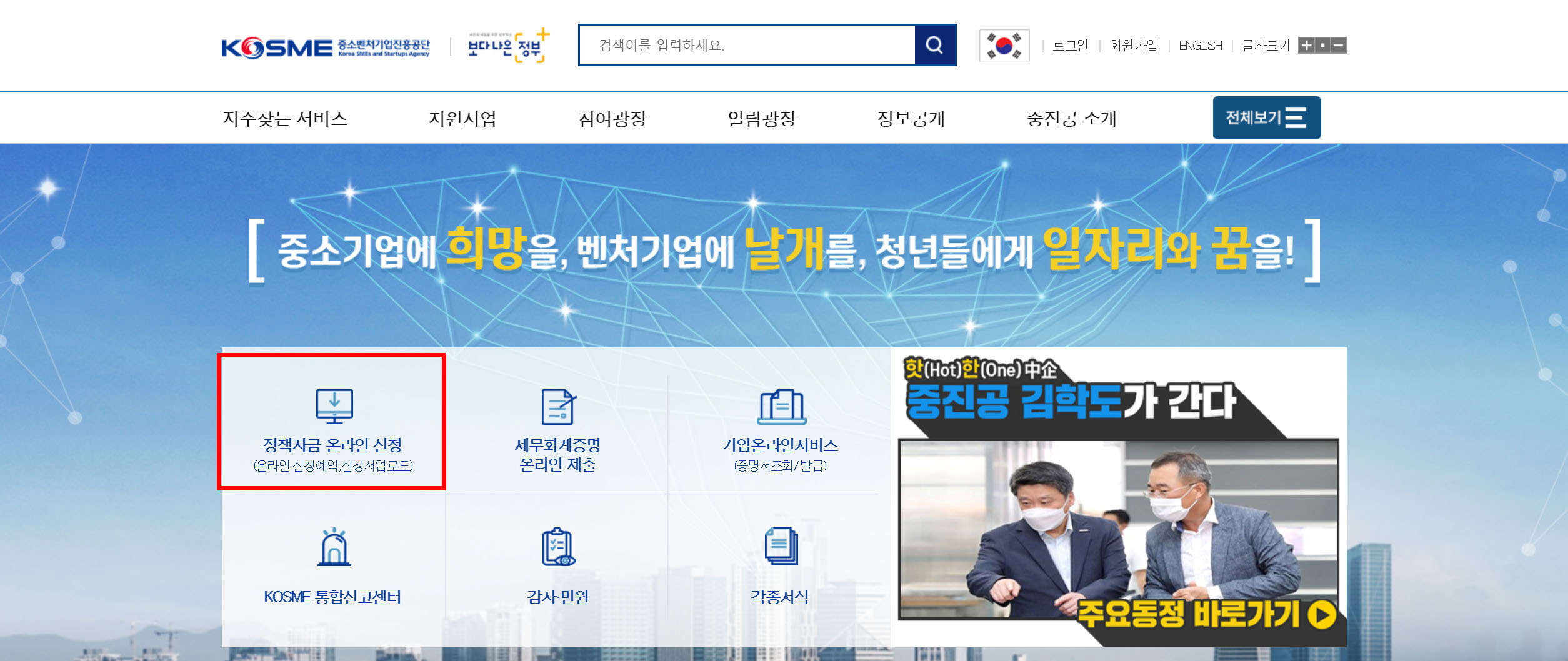 중소벤처기업진흥공단 사이트에 접속하신 후 '정책자금 온라인 신청' 항목을 선택해 주세요.