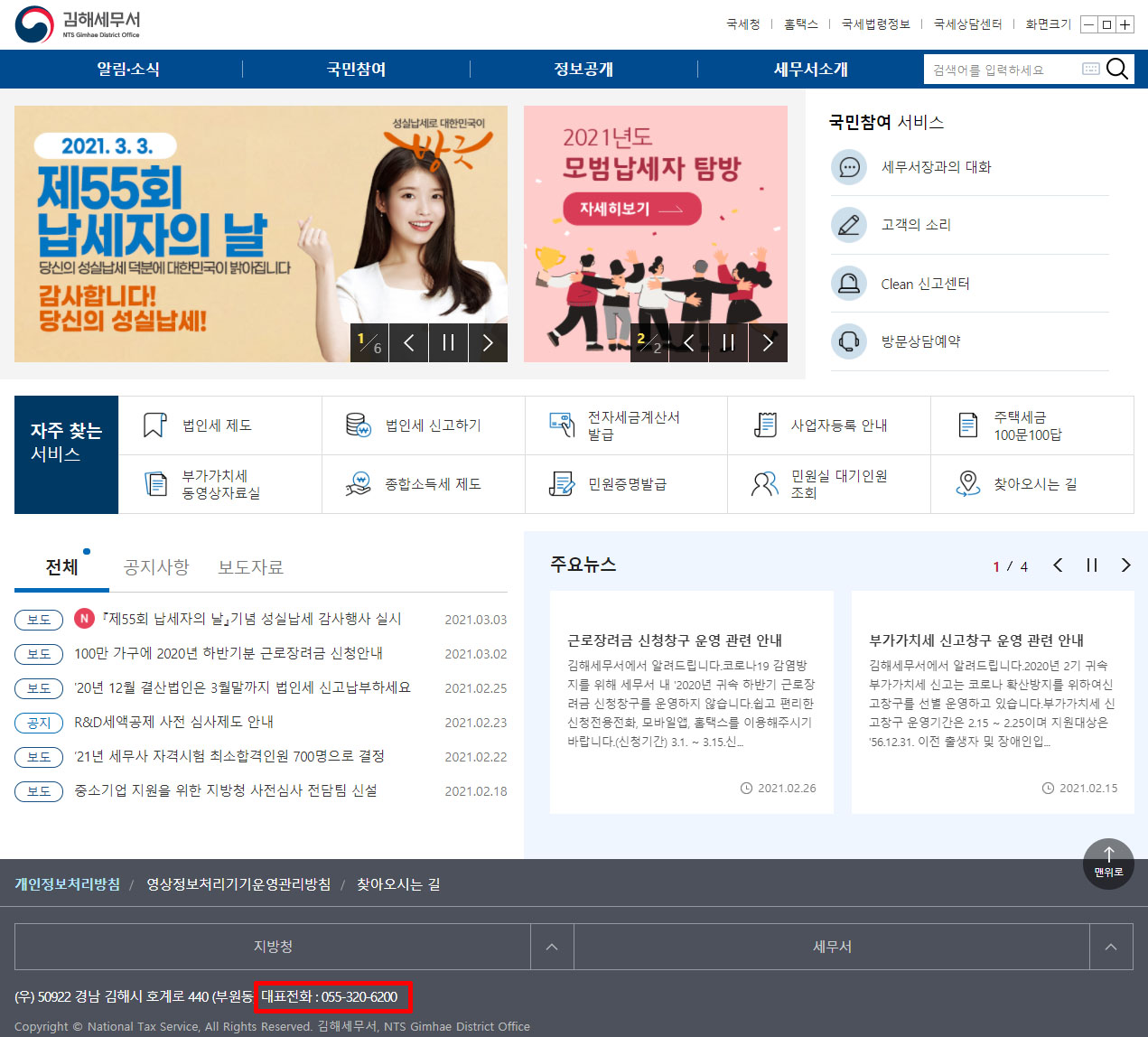 그럼 해당 관할세무서 홈페이지로 접속이 되며, 홈페이지 제일 하단에 대표전화번호가 나와있어요.